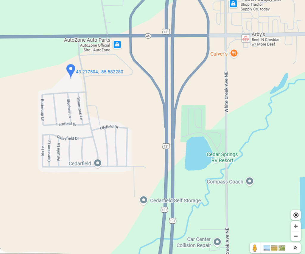 Our meeting this month will be at the Community Center of the Cedarfield 55+ MHC at 3592 17 Mile Rd NE, Cedar Springs, Michigan.