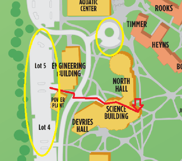Please park in Parking Lots 4 or 5, or if in need of accessable parking, the circle marked on the map below, and make your way
